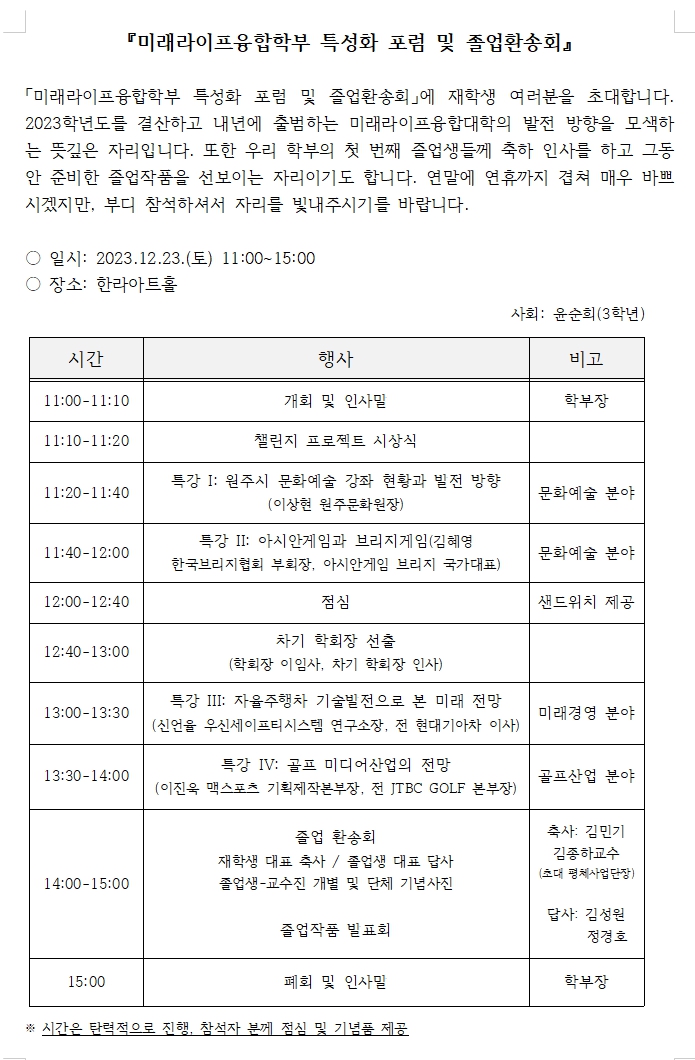 지난 12월23일(토) 한라아트홀에서 특성화포럼 및 졸업환송회가 있었습니다. 행사는 챌린지 프로젝트 시상식을 시작으로 초청 전문가의 특강, 차기 학회장 선출, 졸업환송회로 이어졌으며, 윤순희(3학년) 학우의 사회로 진행되었습니다.