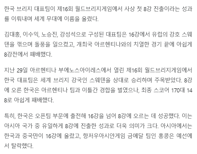 브리지게임 수업을 담당하시는 노승진교수님이 지난달 아르헨티나 부에노스아이레스에서 개최된 제16회 월드브리지게임에서 사상최초로, 아시아에서 유일하게 8강에 진출했습니다. 자랑스럽고 축하드립니다~~~!!!!!