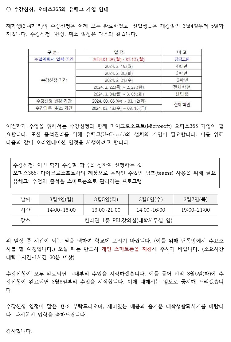 2024학년도 1학기 수강신청 안내
