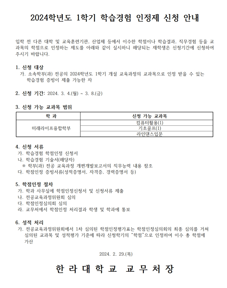 ![]() 1학기 학습경험인정제 신청안내입니다. 컴퓨터활용(1), 기초골프(1), 라인댄스입문 과목에 대해 본교 입학 전의 학습경험이 있고 이를 증빙할 수 있는 경우 신청해 주시기 바랍니다. 컴퓨터활용(1): 컴활자격증, 마이크로소프트 MOS 자격증 취득 등 컴퓨터 사용에 충분한 실력이 인정되는 경우 기초골프(1): 생활체육자격증(골프), 프로테스트 참가 등의 실력이 인정되는 경우 라인댄스입문: 라인댄스 관련 자격증, 강사경력 등의 실력이 인정되는 경우 주의사항: 반드시 본교 입학 전의 경험으로 인정되어야 합니다. |