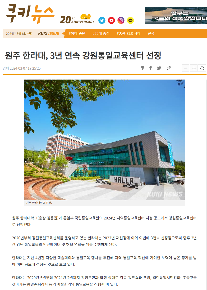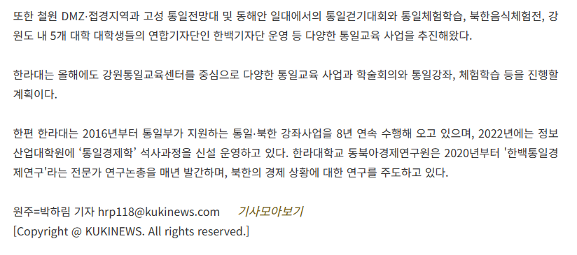 원주 한라대, 3년 연속 강원통일교육센터 선정 (kukinews.com)