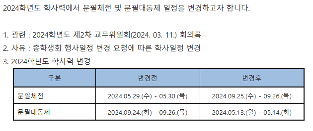 학사일정 변경안내(문필대동제)