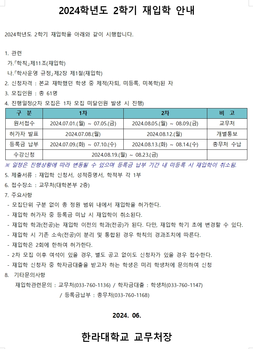 2024학년도 2학기 재입학 안내