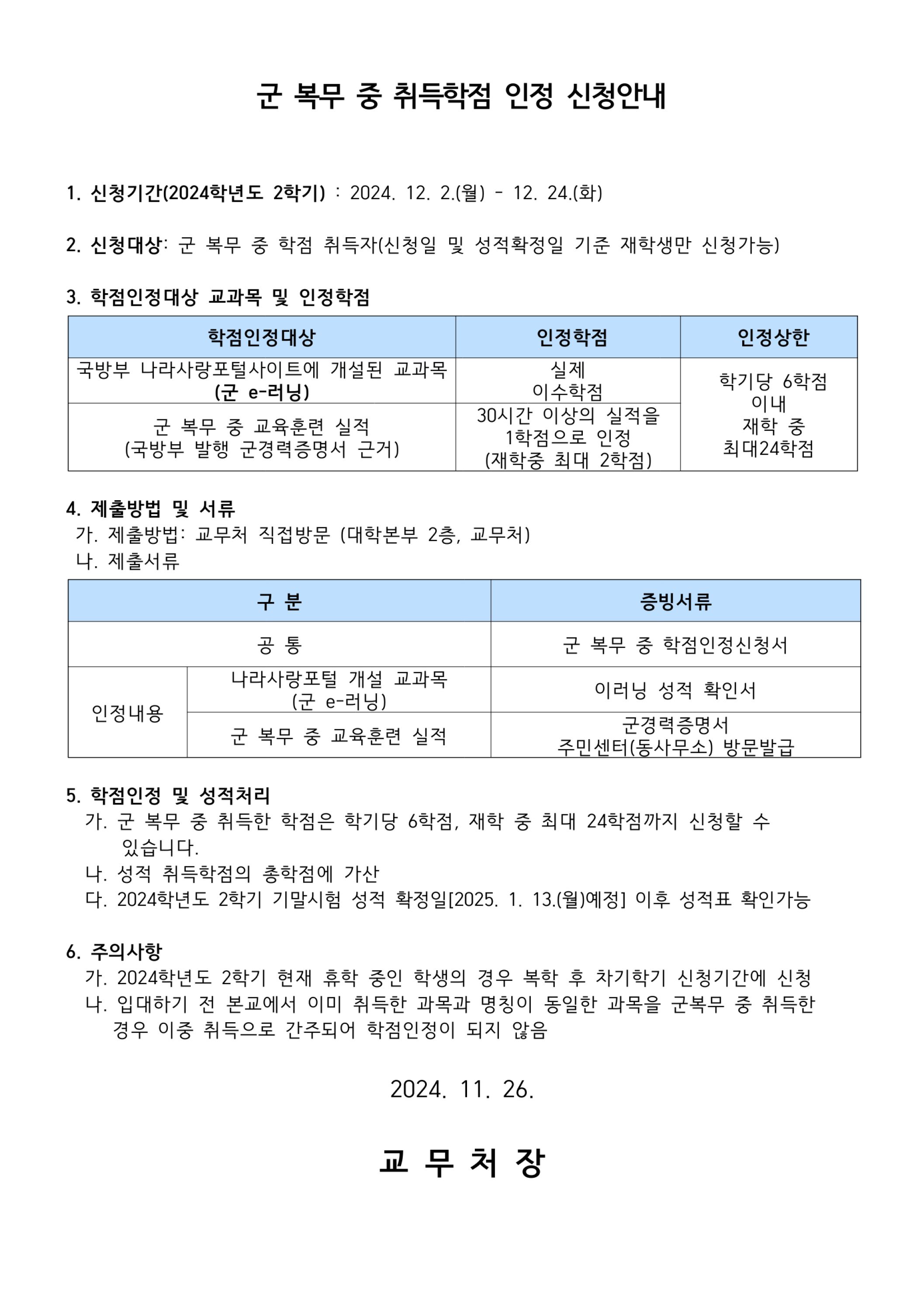 2024학년도 2학기 특별학점(군 복무 중 학점 취득자) 신청 안내