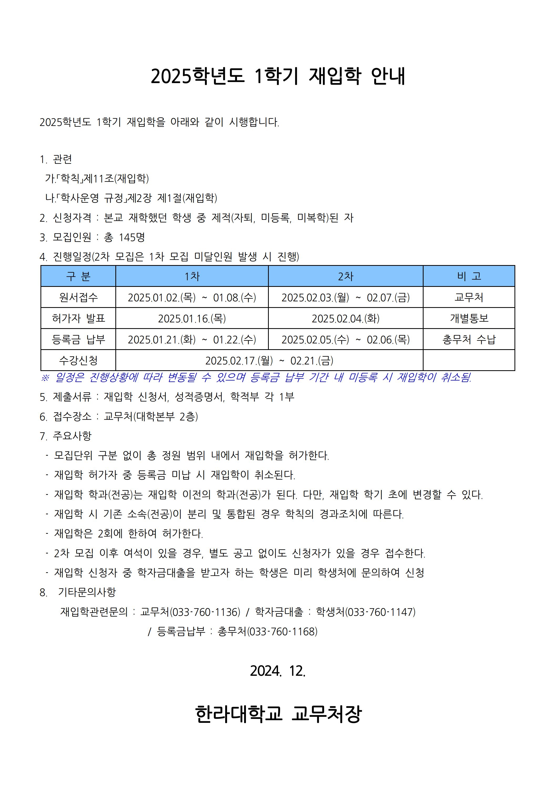 2025학년도 1학기 재입학 시행 안내