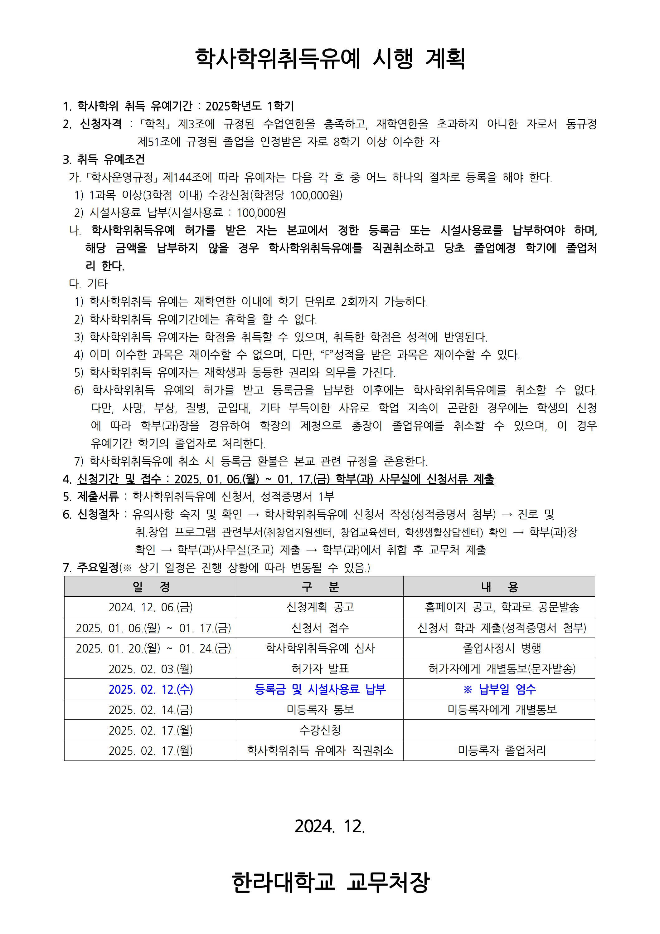학사학위취득유예 시행계획(2024학년도 전기(2025학년도 1학기)).jpg