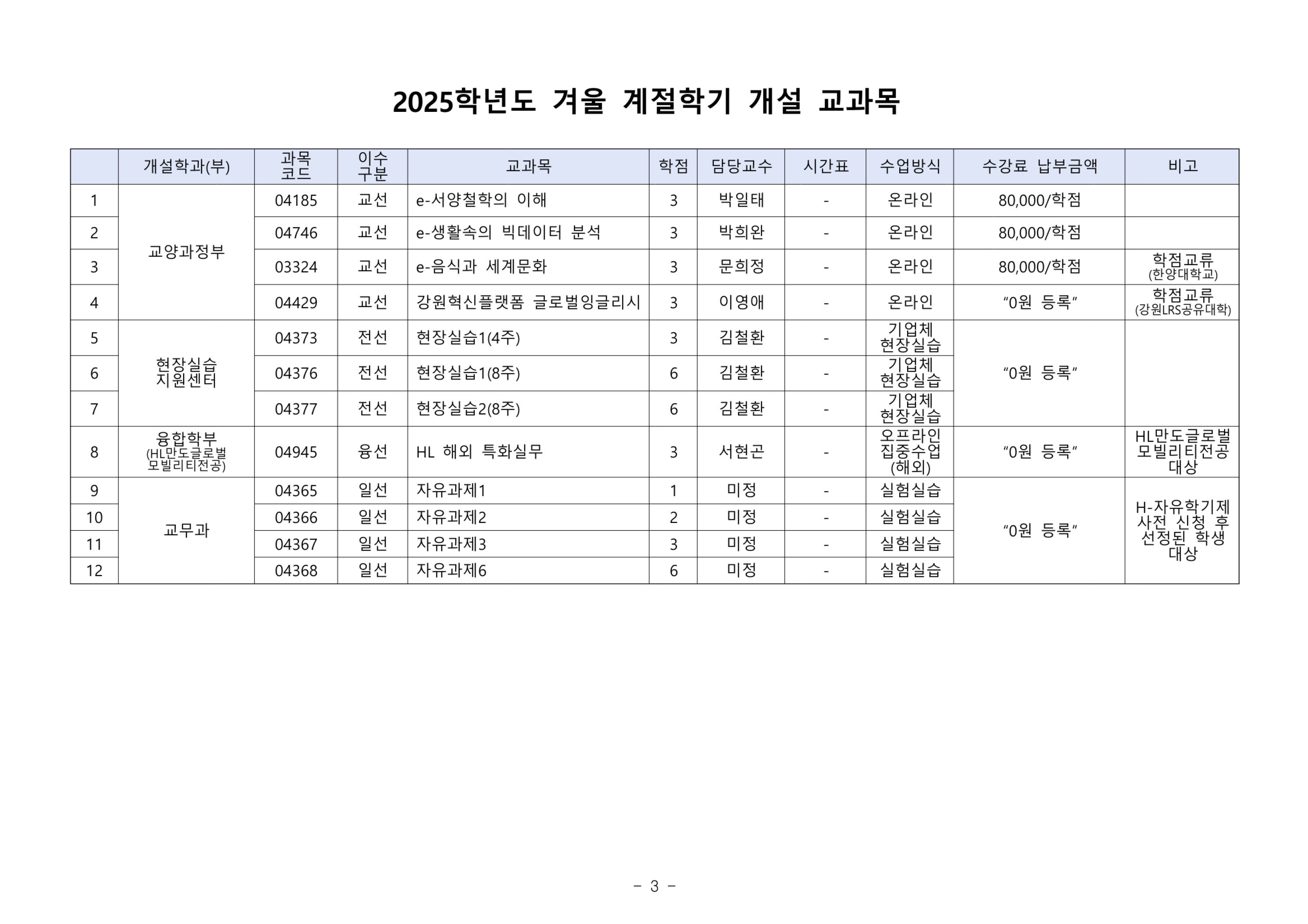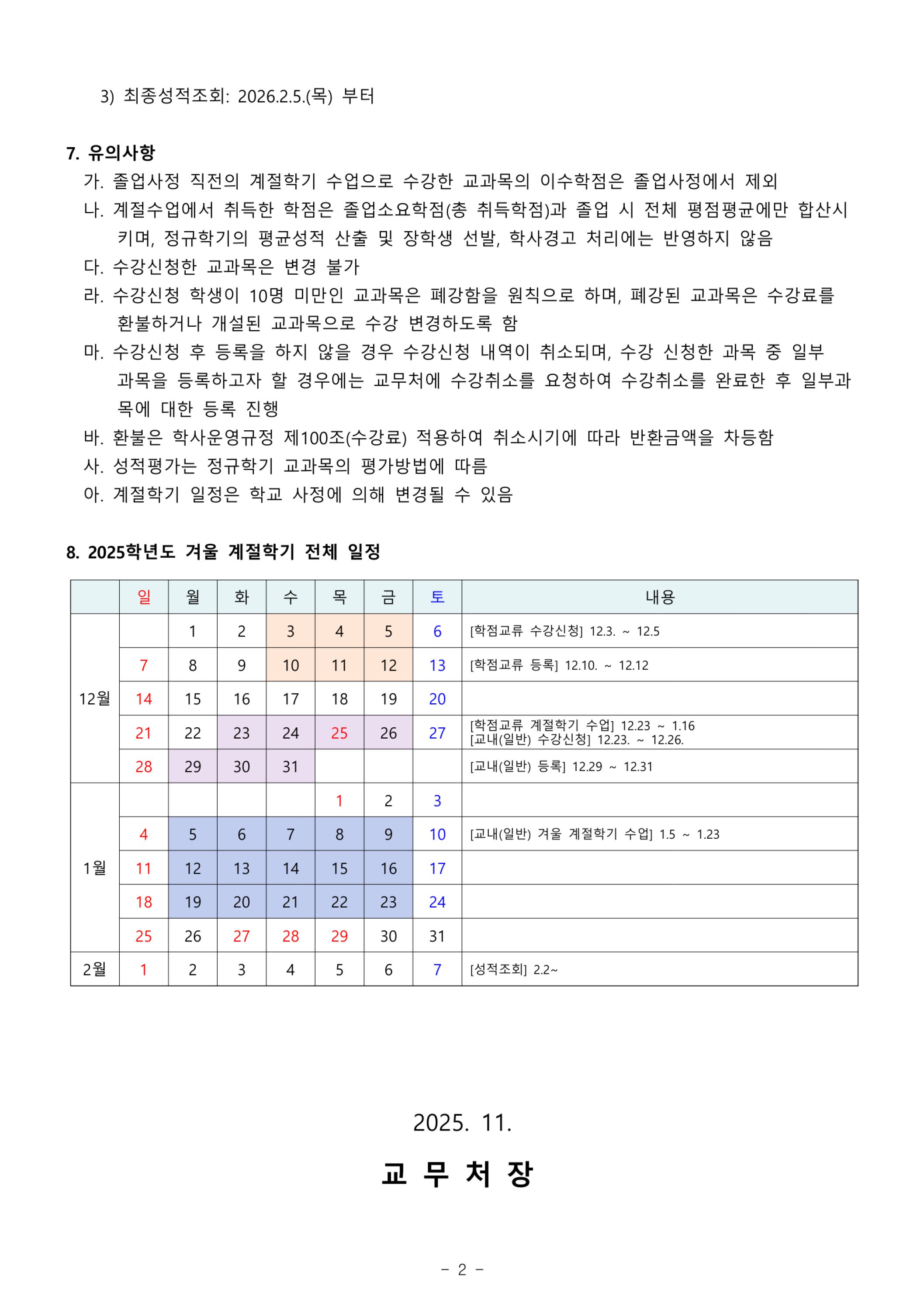 2025학년도 겨울 계절학기 시행안내